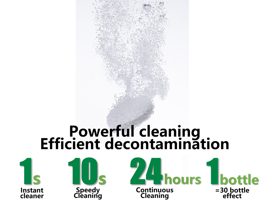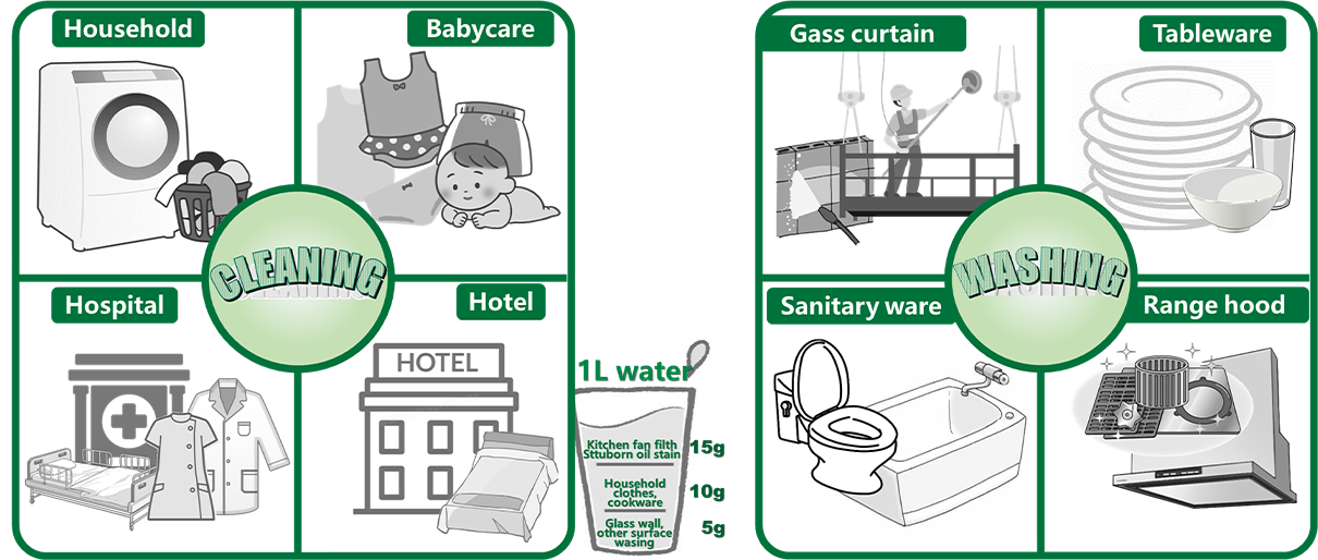 Cleaning/sterilization/disinfection is completed in one step. The environment-friendly, multifunctional and multipurpose cleaning agent can be used for cleaning kitchen and sanitary ware and clothes. It can remove blood stains, fruit stains, oil stains, sweat stains, wine stains, and yellowing of fabrics, especially to avoid skin damage caused by heavy metal ions in water. The product has passed the EU Oeko-Tex? 100 ecological certification.