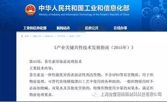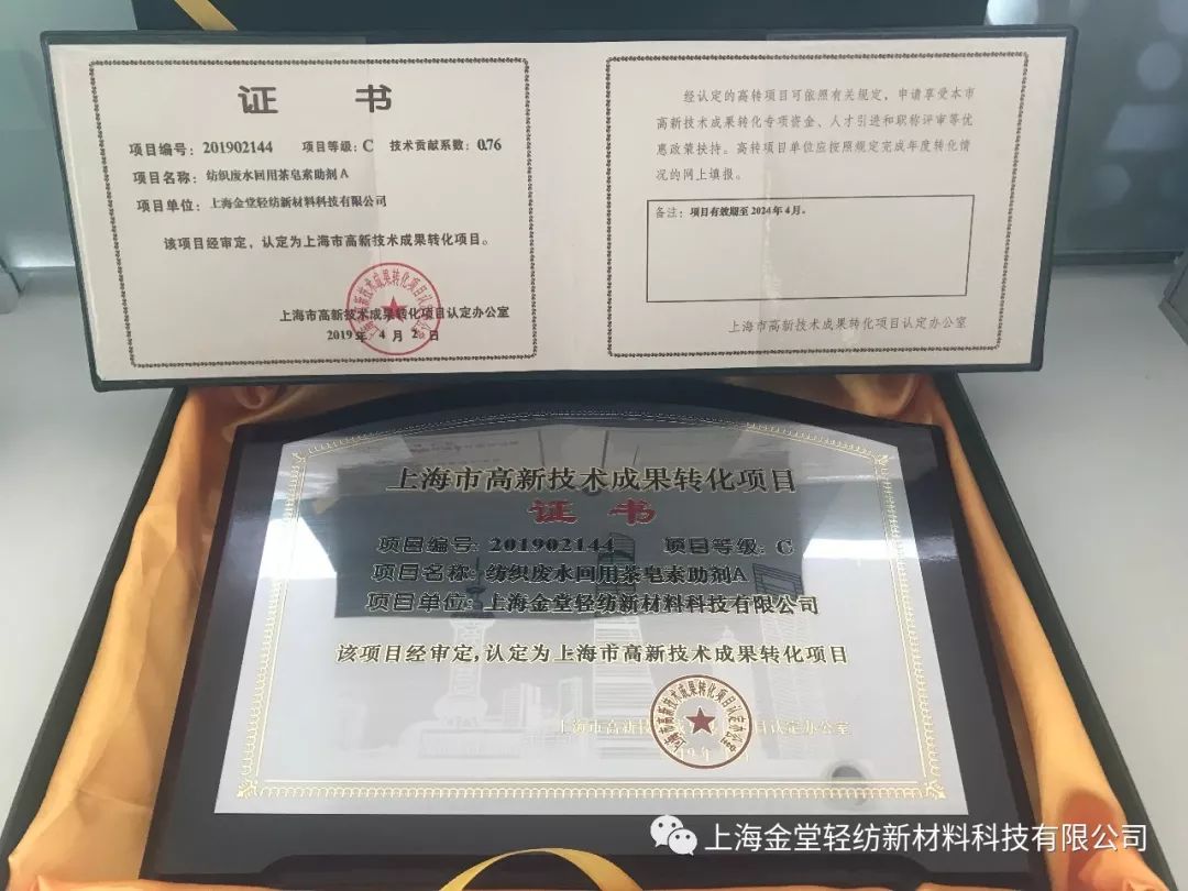 ? ? ? 為解決印染織物前處理頑疾,助推印染行業(yè)健康、綠色、可持續(xù)發(fā)展,上海金堂輕紡新材料科技有限公司十年磨一利劍,成功開(kāi)發(fā)卜公茶皂素助劑,并于近日喜獲2019年第2批上海市高新技術(shù)成果項(xiàng)目認(rèn)證。