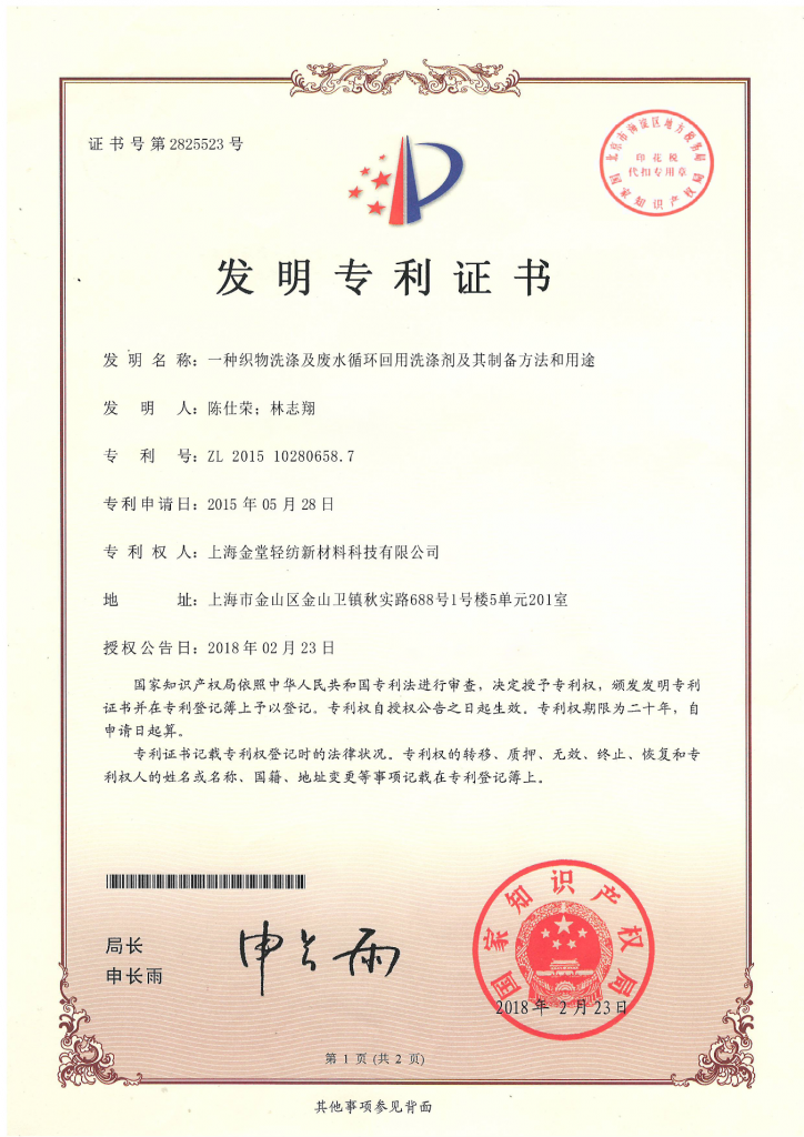 摘要本發明公開了一種織物洗滌及廢水循環回用洗滌劑及其制備方法和用途。該洗滌劑由茶皂素、雙氧水與水調配而成;其中,茶皂素5%~30%,雙氧水5%~20%,其余為水。本發明的洗滌劑可用于織物首次洗滌,并添加在之后得到的織物洗滌廢水中,即可使廢水再生,循環回用。本發明的洗滌劑為高效的織物洗滌劑產品,生態環保,減少化學品的使用,并免加燒堿、次氯酸鈉、洗衣粉等各類化學品,而且使用時不必再添加其他有害化學品即可滿足織物洗滌潔凈工藝要求,同時減少新鮮水用量和減少洗滌工序廢水排放,又大幅度降低生產成本,同時節省工時,并避免設備腐蝕和織物損傷,提高洗滌產品質量,保證人身安全,實現生態環保化安全生產作業。