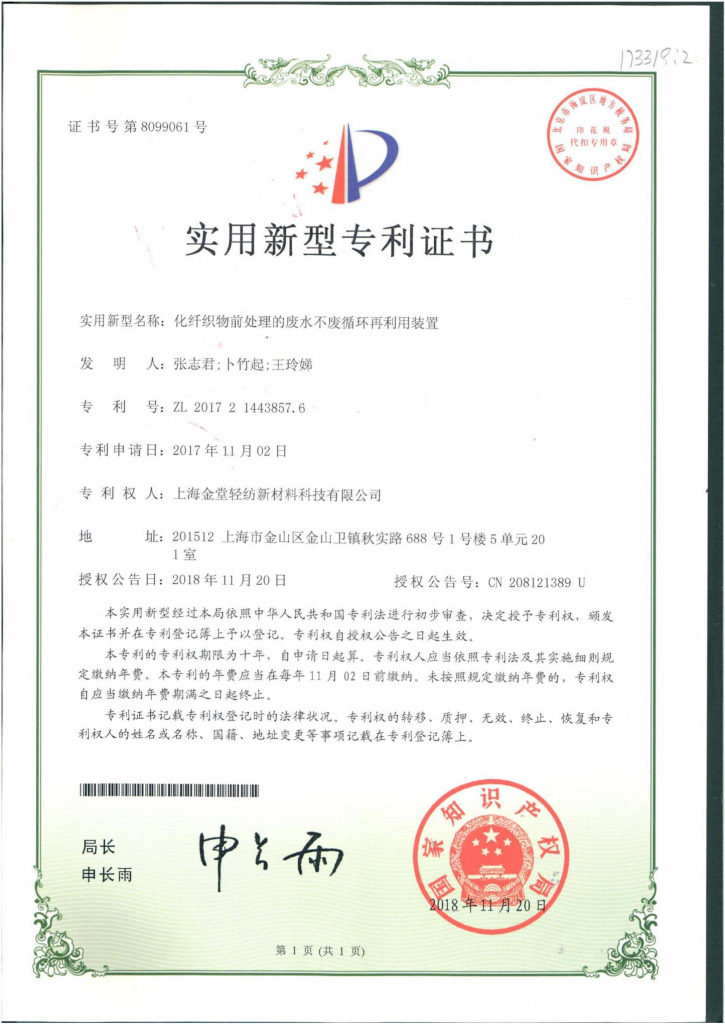 摘要:本實用新型提供了一種化纖織物前處理的廢水不廢循環(huán)再利用裝置,包括依次連接的織物染色機、廢水存儲池和過濾裝置;過濾裝置的出水口連接織物染色機的進水口。織物染色機上連接有試劑箱,試劑箱內設有用于前處理工藝的前處理助劑,該前處理助劑為卜公茶皂素。本實用新型采用卜公茶皂素為前處理助劑,可利用化纖織物前處理的廢水回收再利用裝置,實現化纖織物前處理工藝廢水回用于化纖織物印染前處理工序,不僅可以滿足織物染色質量要求,還可以降低生產成本,減少新鮮水的用量和廢水的排放量,對于減輕環(huán)境污染,緩解水資源短缺問題,具有重要的現實意義。