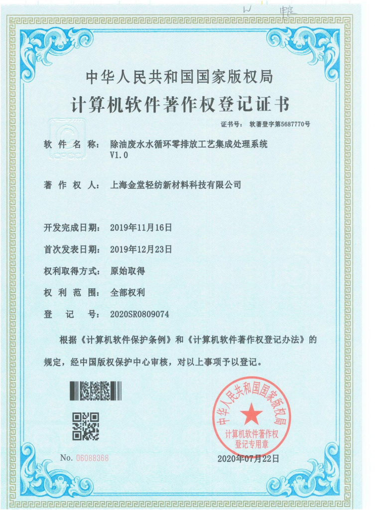 軟件名稱:除油廢水水循環零排放工藝集成處理系統V1.0