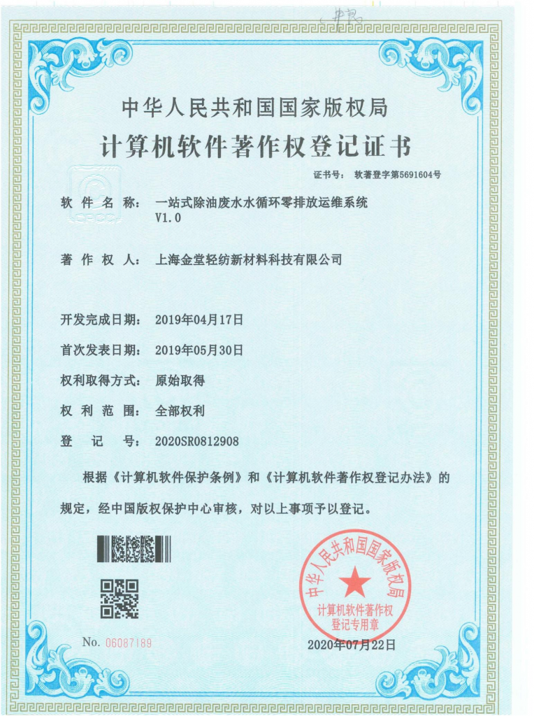 一站式除油廢水水循環零排放運維系統V1.0,登記號:2020SR0812908