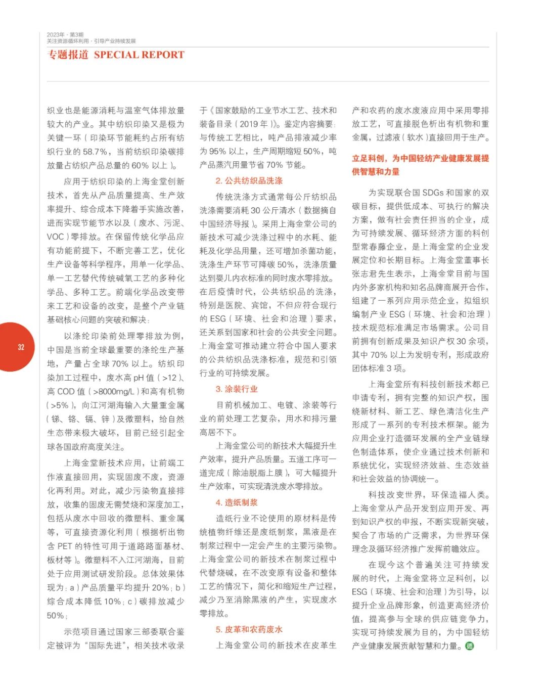 ? ? ? 近日,《中國循環經濟》雜志發文,重點報道了上海金堂以全球首創的紡織印染低碳前處理工藝新技術及產品為代表,在SDGs(聯合國可持續發展)國際公認理念目標導向下,助力企業解決環境保護與盈利發展困局難題,以建立產業ESG技術規范標準為抓手,為行業未來發展開拓空間的創新成果。