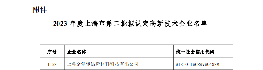 ? ? ? 近日,上海金堂輕紡新材料科技有限公司順利通過相關(guān)評審,繼2020年之后,再次獲得國家高新技術(shù)企業(yè)稱號。
