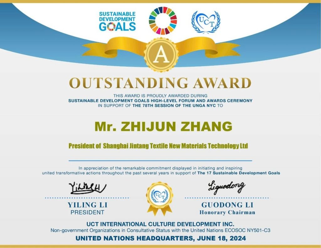 峰會(huì)期間,78屆聯(lián)合國(guó)教科文組織旗下UCT宣布,上海金堂輕紡新材料科技有限公司董事長(zhǎng)張志君榮獲可持續(xù)發(fā)展領(lǐng)域卓越成就獎(jiǎng)(2024年6月18日正式授予獎(jiǎng)牌)