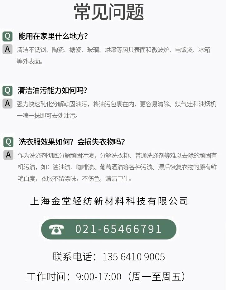1.脫排油煙機:將粉體溫水溶解成液體(1升水加入15克粉體),噴于油污表面或浸泡脫排油煙機濾網在稀釋液中 。待3-5分鐘后再用抹布搽干凈或清水沖凈。